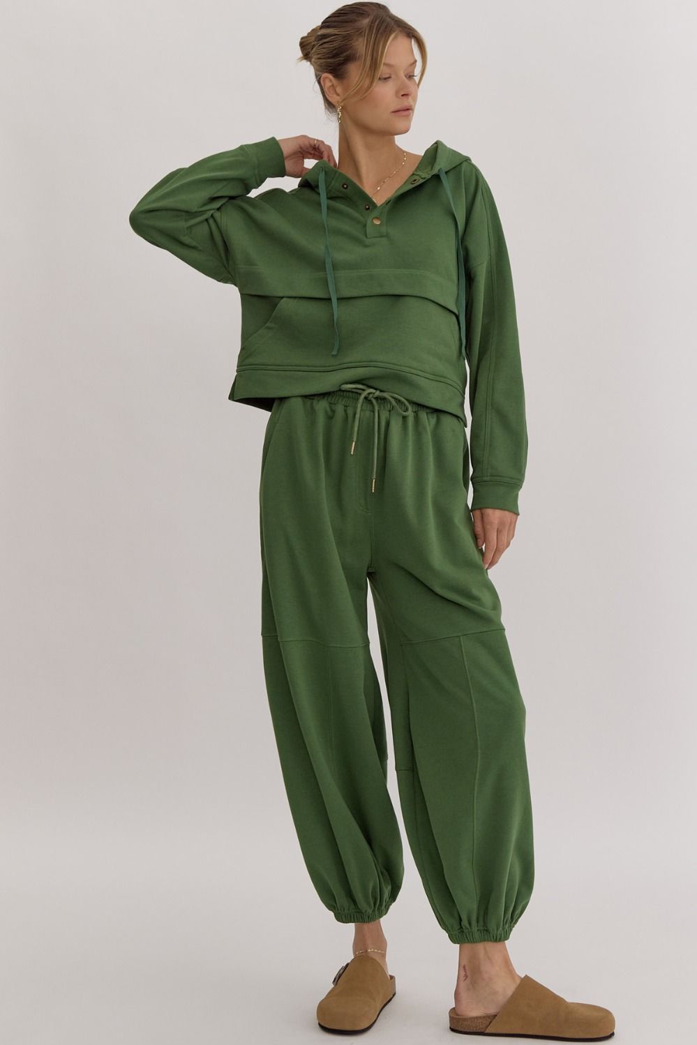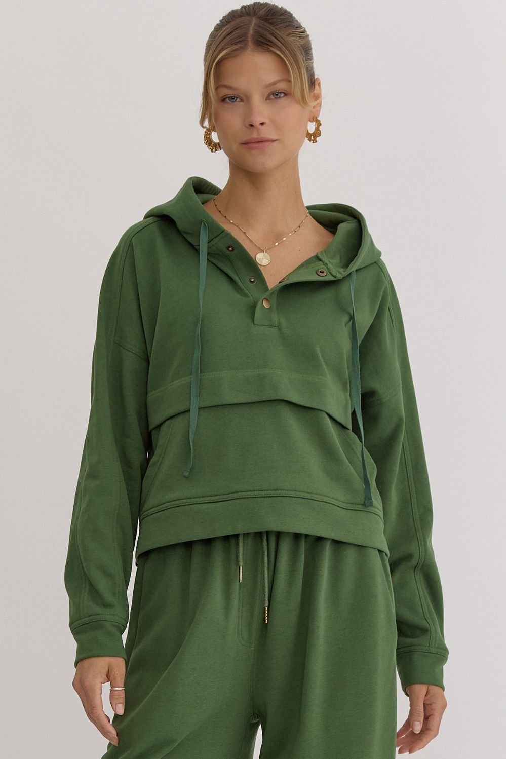 Solid long sleeve sweater featuring hood. Self tie and button closure. Front pockets.